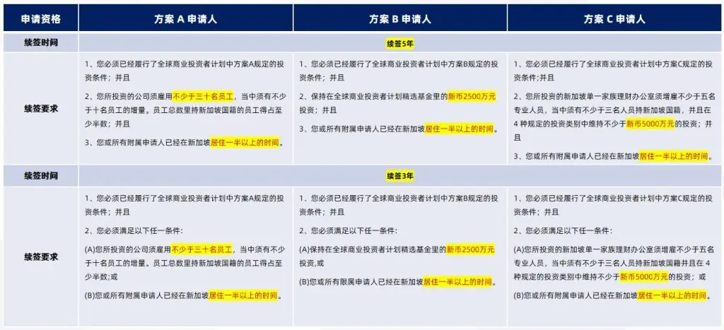 | 选项A:创业或扩展现有业务 | 1. 投资金额已满足GIP要求。 2. 公司雇佣至少30名员工,其中至少50%为新加坡公民,且10名为新增员工。 3. 申请人及其家属需在新加坡居住超过一半时间。 |